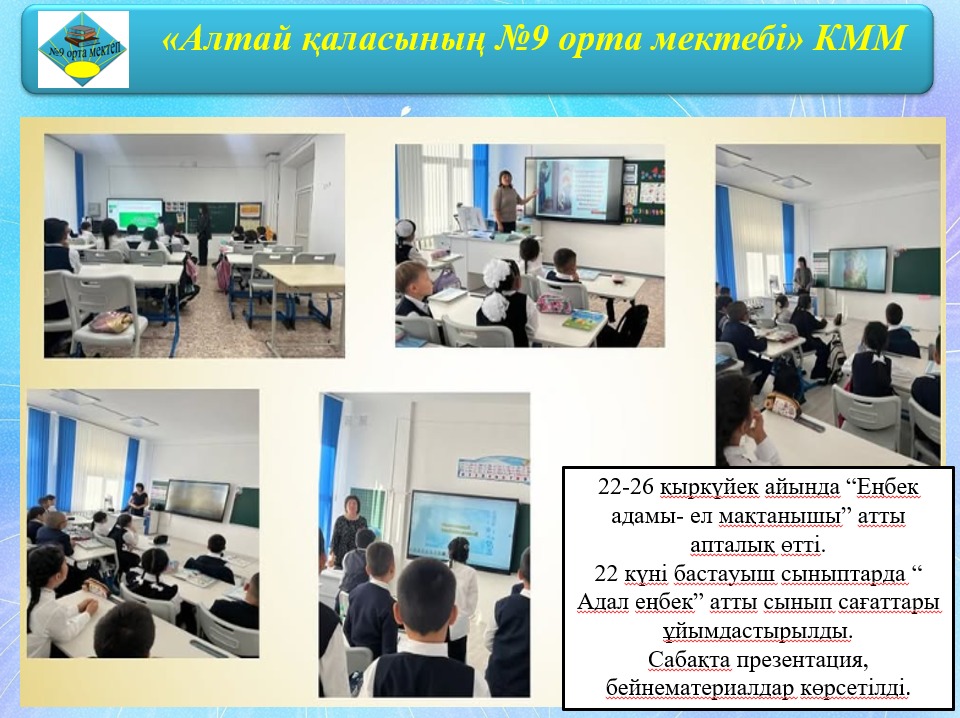 22 қыркүйек күні бастауыш сыныптарда “ Адал еңбек” атты сынып сағаттары ұйымдастырылды.
