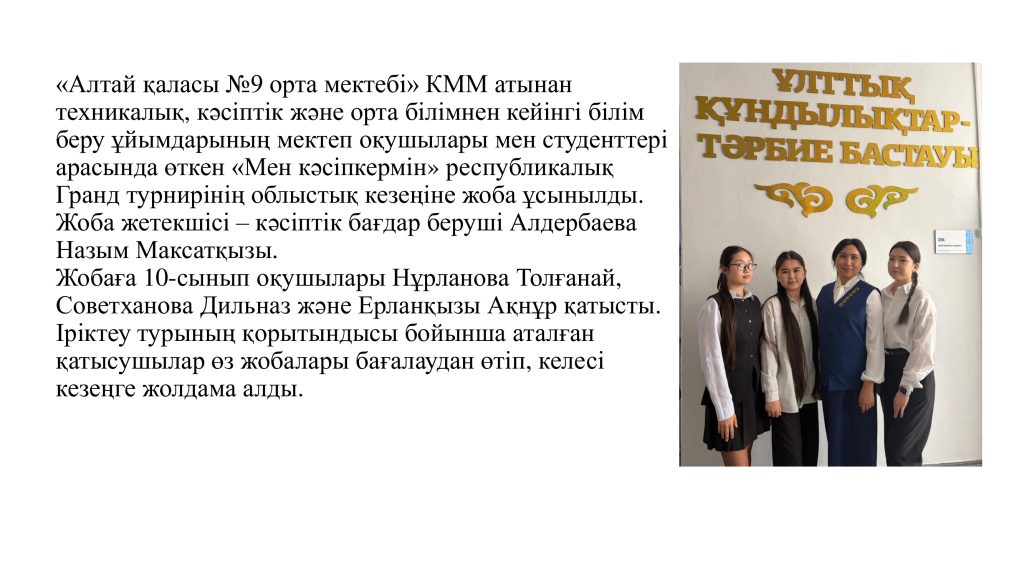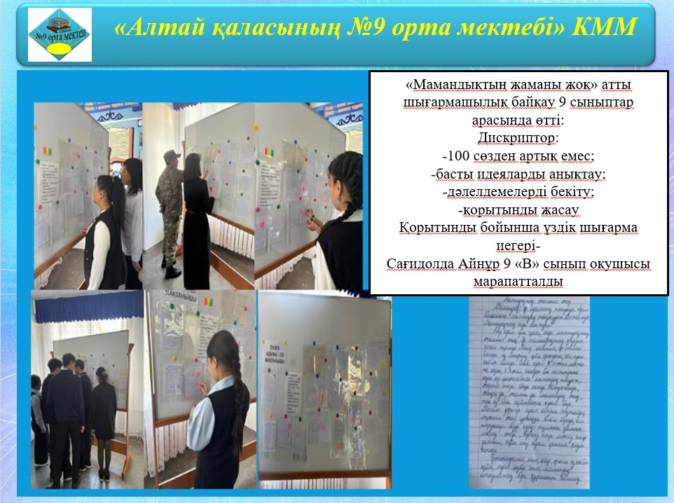 9 сыныптар арасында «Мамандықтың жаманы жоқ» атты шығармашылық байқау өткізілді.