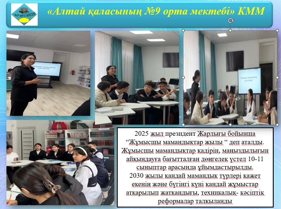“Жұмысшы мамандықтар жылы тақырыбы бойынша 10-11 сыныптар арасында дөңгелек үстел ұйымдастырылды.